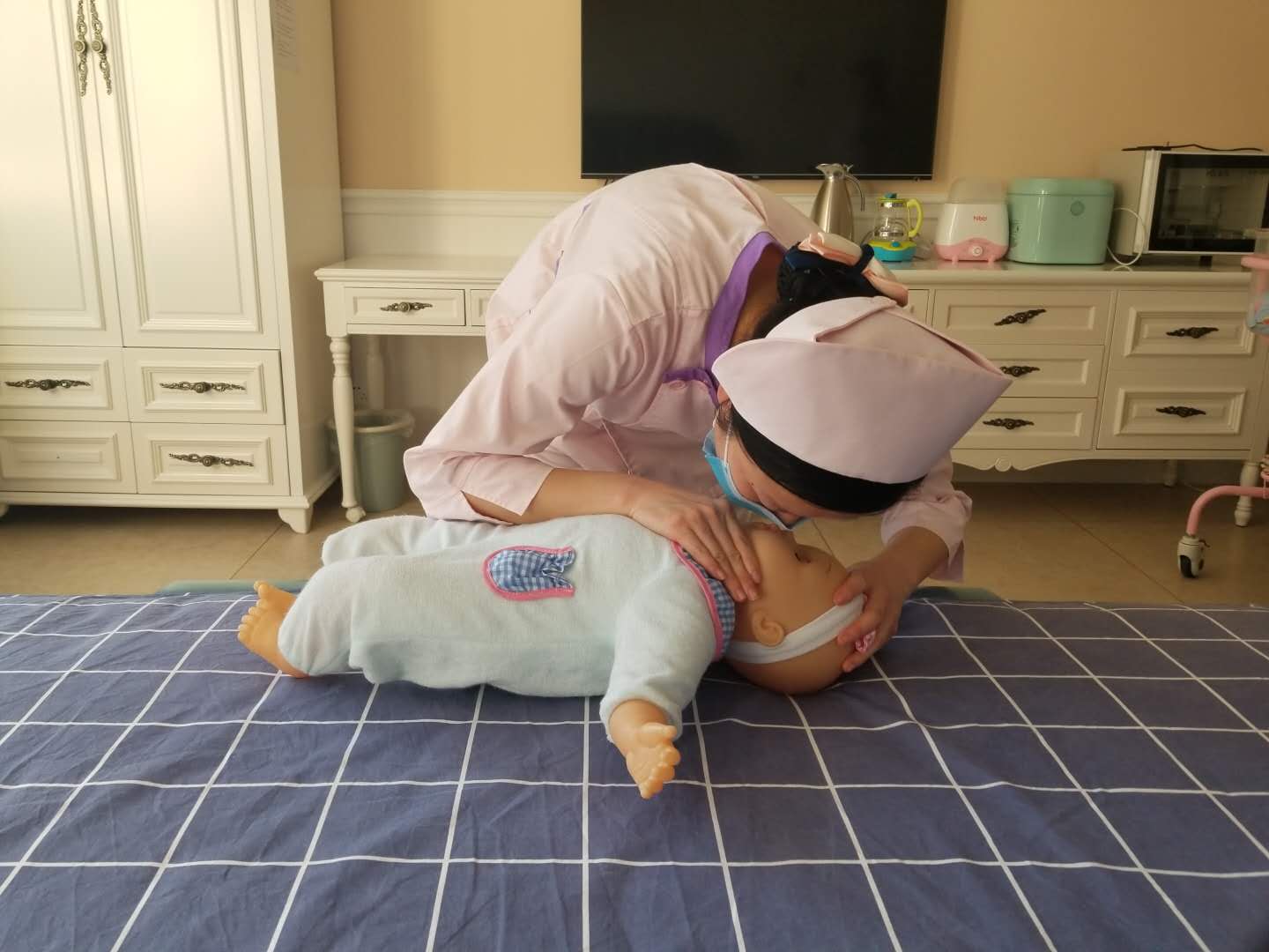 操作方法:立即將患兒取頭低腳高位,俯臥在施救者腿上,讓嬰兒上身前傾45~60度,施救者左手虎口打開、托住嬰兒下頜、打開氣道,用右手掌跟大魚際部位用力扣拍嬰兒背部4—5次,具體位置為背部肩胛骨中間,通過振動使吸入呼吸道的奶汁或痰液排出。