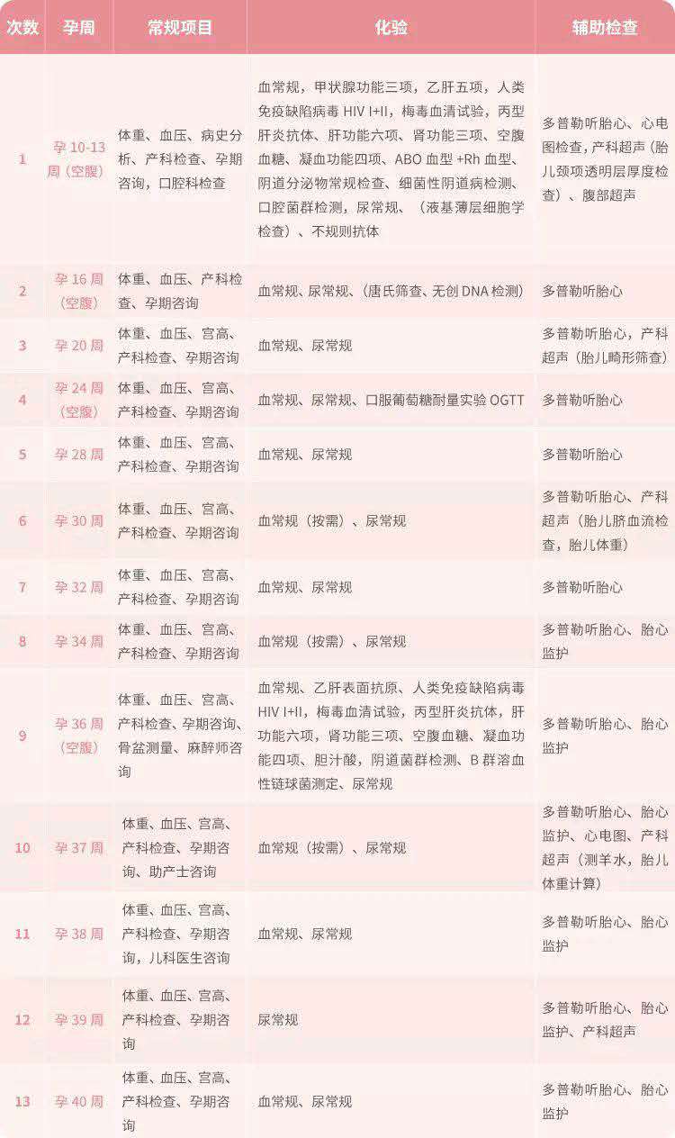 一般情況下,整個孕期準(zhǔn)媽媽大約需要進行13次以上的產(chǎn)檢,每個時期關(guān)注的重點也是不一樣的。